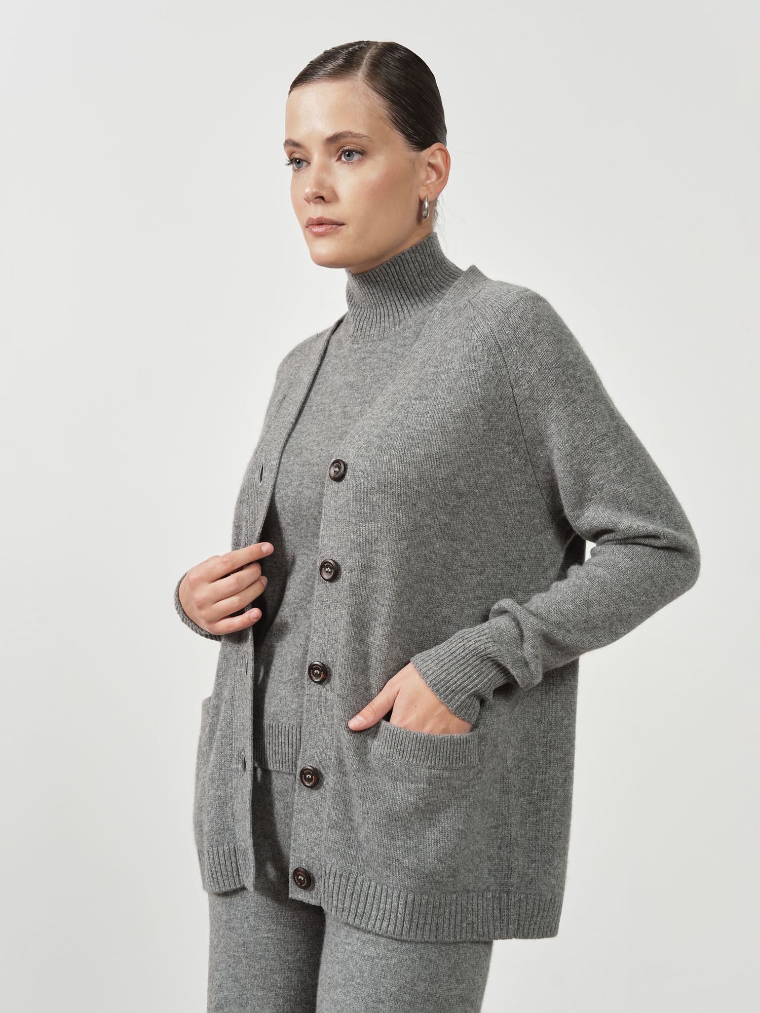 Модель выполнена с V-образным вырезом и застёжкой на пуговицы. Прямой крой и минималистичный стиль делают кардиган универсальным и практичным.