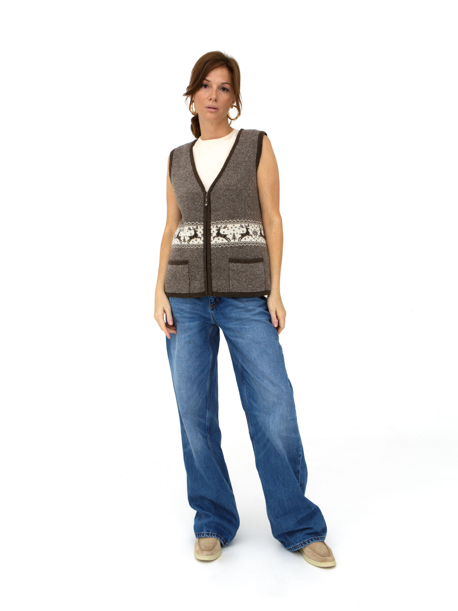 Жилет из 100% шерсти на замке 12W07001 c рисунком коричневый